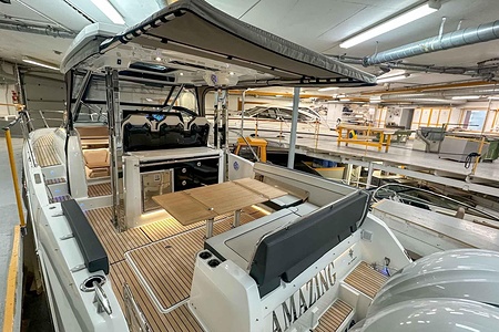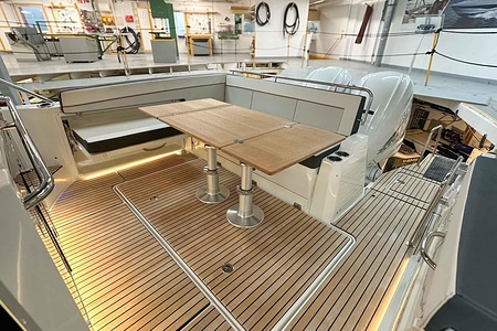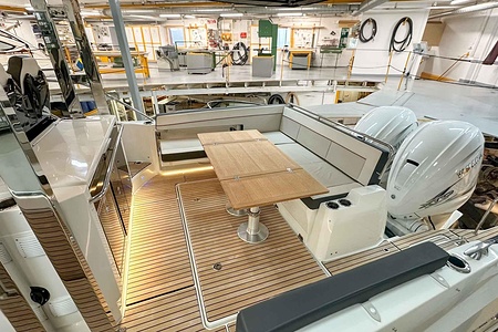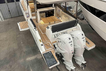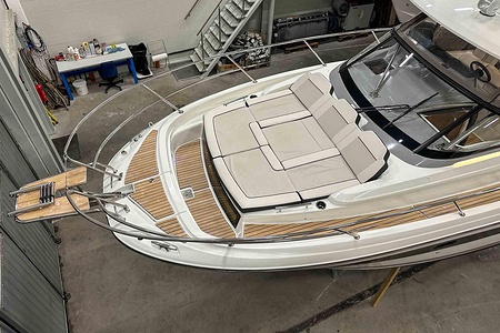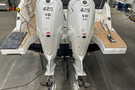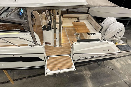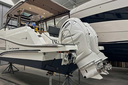Unikt udstyret Cap Camarat 10.5 Serie 2 til salg! I modsætning til mange lignende både i Europa, som ofte er udstyret med de mindre V6 300 hk-motorer, har vores båd den ultimative drivlinje – dobbelte Yamaha V8 XTO 425 hk med joystickstyring. En kombination der gør båden til en kraftfuld, smidig og tryg søbåd under alle forhold.