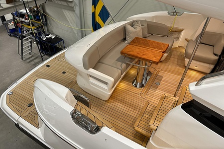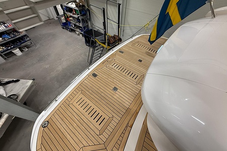 Standard deck material to transom platform, cockpit, and steps to side deck is 6mm teak with black caulking