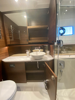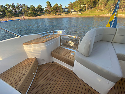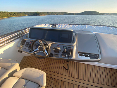 Twin Volvo Penta D13 (2 x 900hp) diesel engines • 2x Volvo Joystick controls • Variable bow thruster with hold function • Hydraulic platform • El-hydraulic bimini • Walnut interior wood, satin finish • Seakeeper stabilizer • Passarelle • Electric winches • 3 double cabins • Heated bathroom floors • Washed /dryer • Dishwasher • Full teak • Generator • BBQ in wetbar • 6x Garmin Glass Cockpit plotters integrated with Volvo autopilot • Radar • Reversing camera • Air conditioning/Heater etc