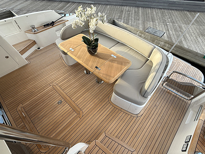 Standard deck material to bathing platform, transom steps, cockpit, flybridge stairway and steps to side deck, is 6mm teak with black caulking
