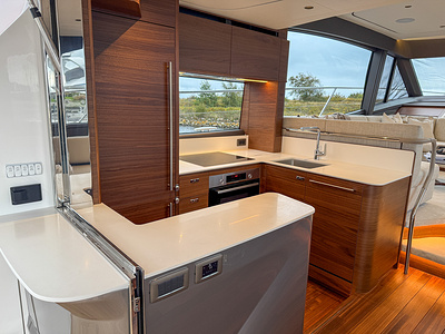 Galley counter top is White Solid Surface (satin finish) as standard. Please note cockpit bar top will match galley countertop selection and galley sink will be stainless steel for all options.