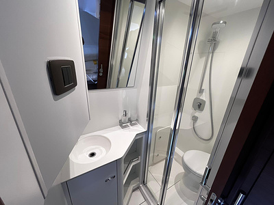 “Aft/crew cabin fit out (single berth with separate head and shower) includes porthole to cockpit seating upstand.