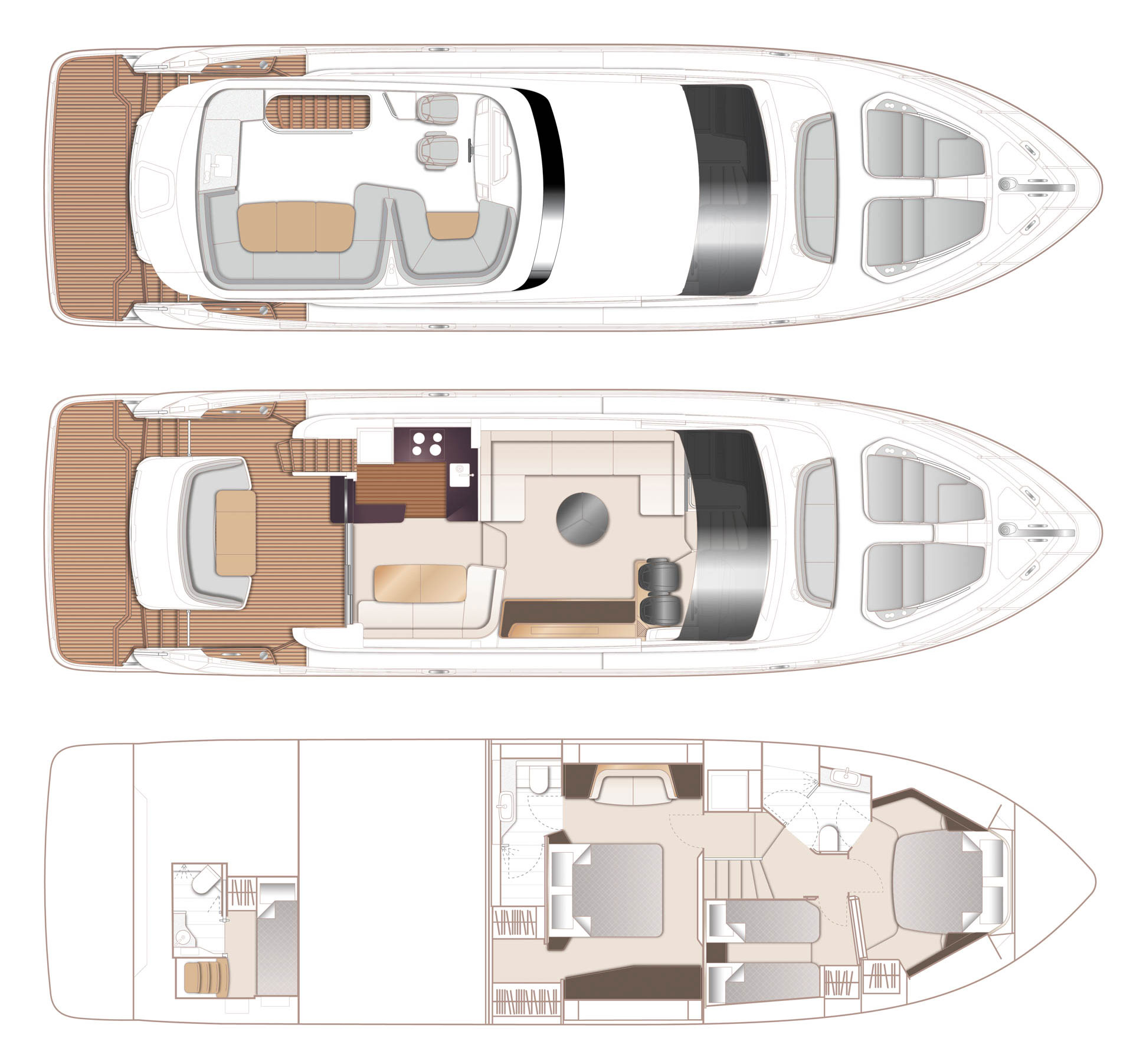 Standard main deck layout, incorporates aft master stateroom with en-suite, forward stateroom and starboard twin berth guest cabin. Forward en-suite/day head.