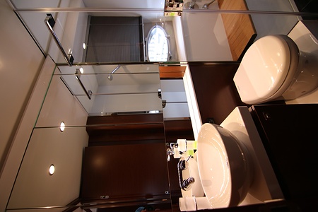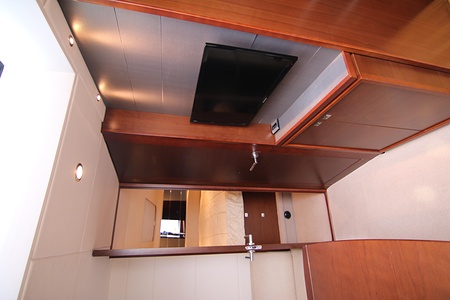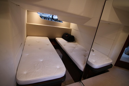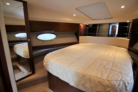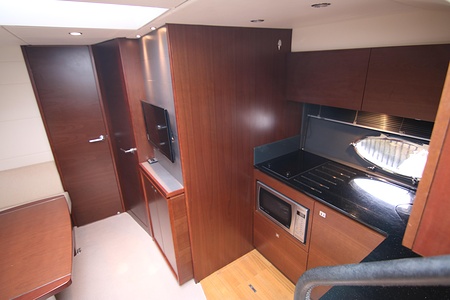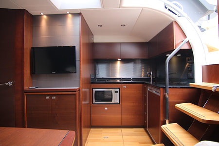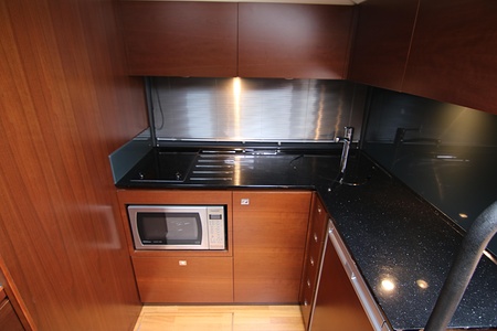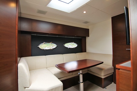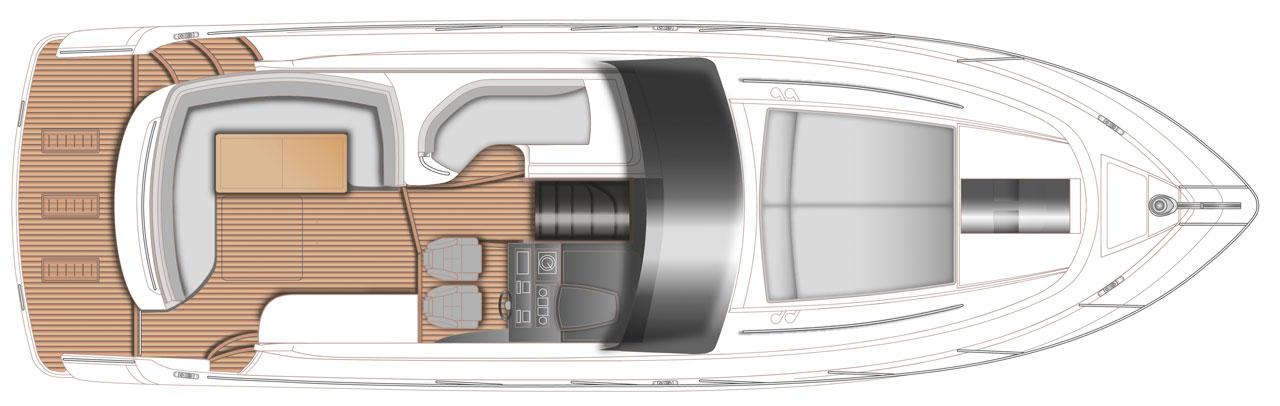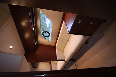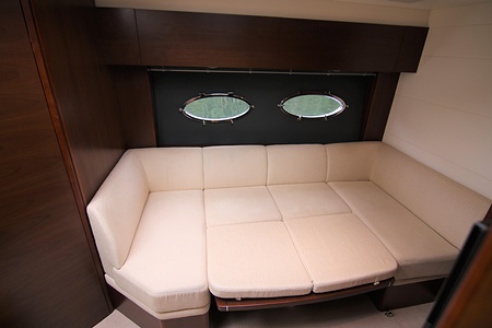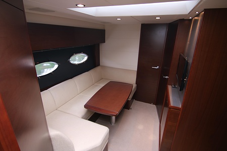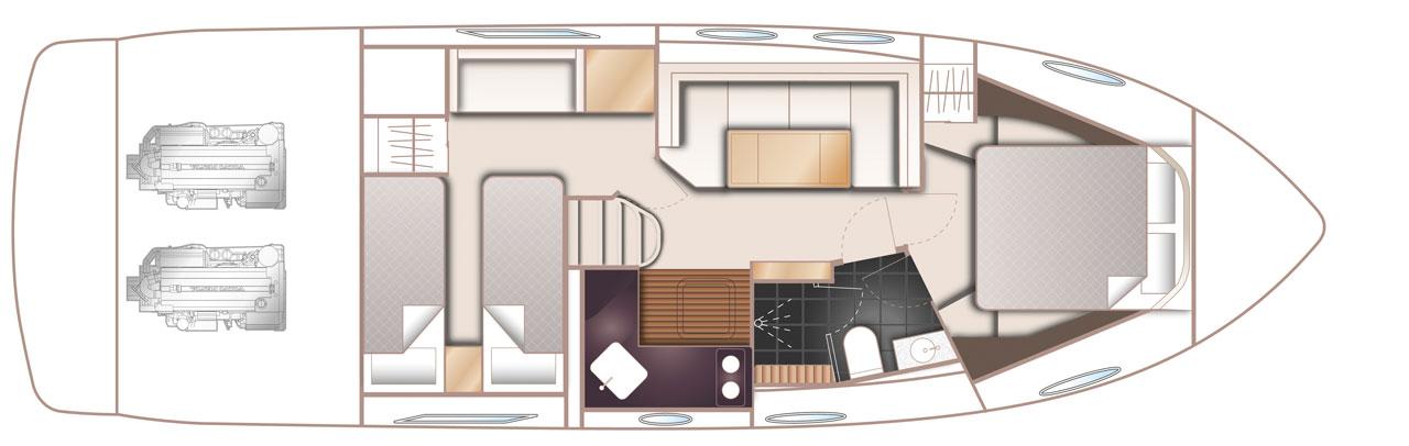 Under dekk har man to kabiner, bad, salong og kjøkken. Totalt 6 sengeplasser om man gjør salongen om til soveplass. Den romslige salongen i kombinasjon med et velutstyrt kjøkken legger til rette for underholdning og et trivelig liv om bord. Begge kabinene utstråler moderne stil og har sjenerøse proporsjoner. Den fremre kabinen har egen inngang til badet, som man også har tilgang til via en andre dør fra salongen. Romslig akterkabin med sofa og en dobbeltseng som kan gjøres om til to enkle senger.