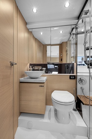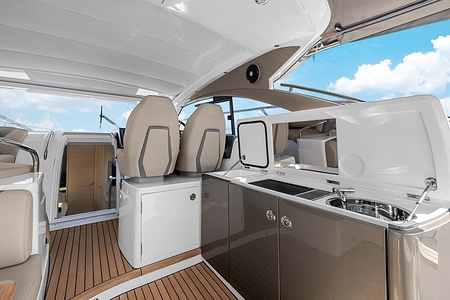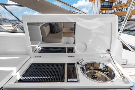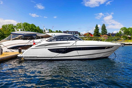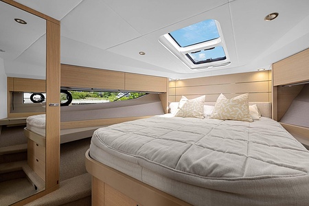 Båten er særdeles velutstyrt med bl.a. senkbar badeplattform, generator, Garmin Glas Cockpit, joystick, varmekabler i baderom og baugspyd. Den romslige akterkabinen har tilvalgt glideskinner som enkelt endrer to enkeltsenger til dobbeltseng.