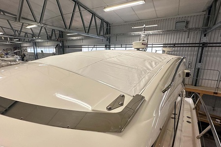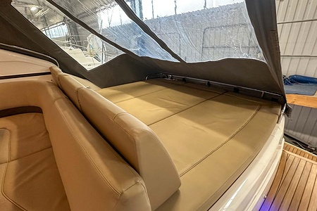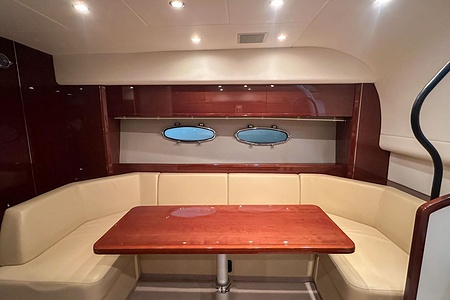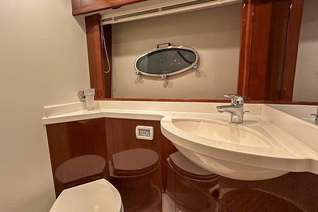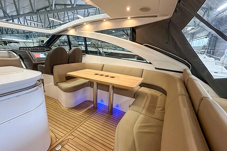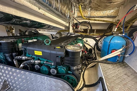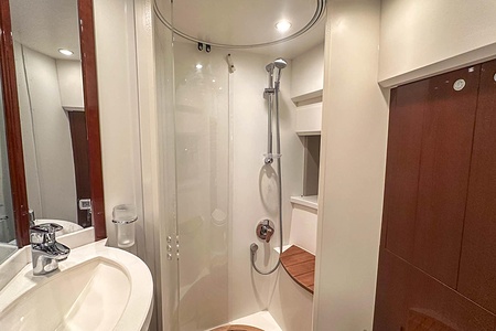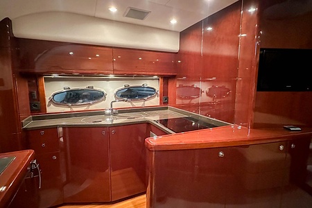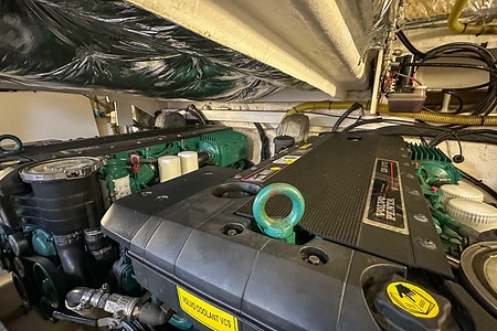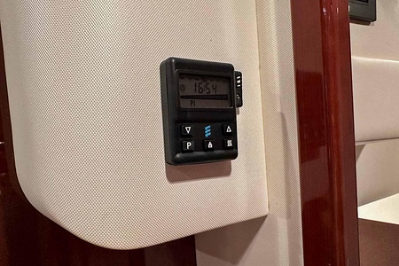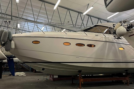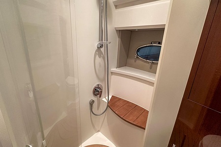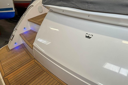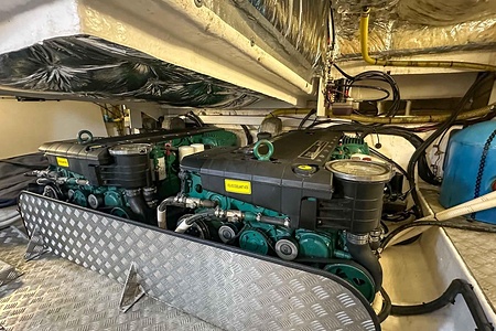 I aktern finns ett rymligt garage för tender, och den väl tilltagna sittbrunnen är utrustad med wetbar innehållande grill, kyl samt både varmt och kallt vatten – perfekt för sociala stunder till sjöss. Båten har genomgått flera fina uppdateringar och är utrustad med helt nylagd teak på badbryggan samt stegen upp mot skarndäcken, vilket ytterligare förstärker det exklusiva helhetsintrycket.
