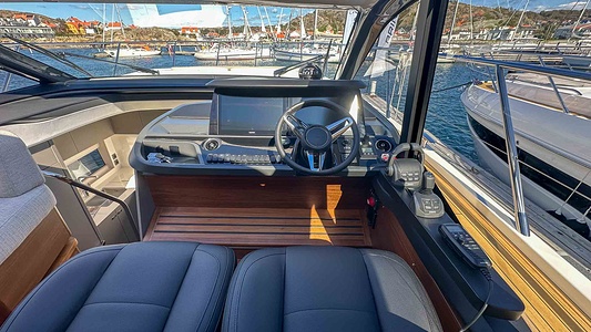Twin Volvo IPS 650 (2 x 480 hp) including joystick control and ACP system. A Volvo autopilot (controlled via 16” Volvo/Garmin multi-function display) with manuella Volvo interceptor trim tabs