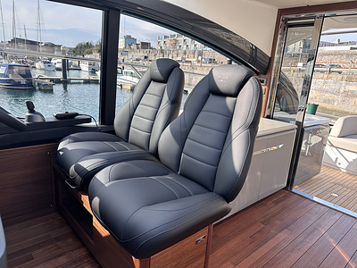 Standard helm console is Anthracite Grey with helm seats in Pitch Black eco upholstery with a Fusion Caviar rear insert panel.