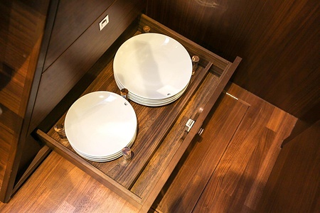 Valnötsinteriör, mattlackerad (durken i salong, pentry och förarplats är i valnöt som standard)
