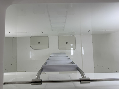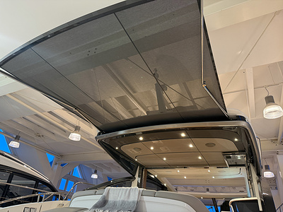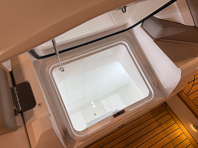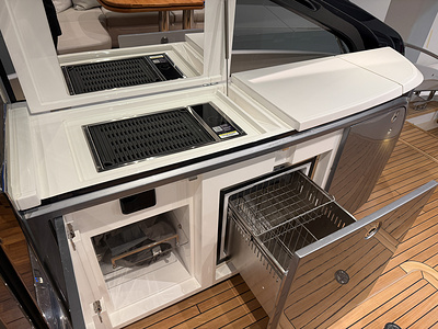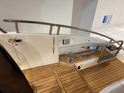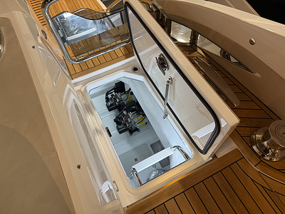 Up/down electro hydraulic transom platform with 450Kg SWL capacity fitted as standard, however if a tender is being carried in the garage (up to 3.45m) it is recommended that the combined weight of tender and additional p.w.c. is no greater than 500Kg when underway