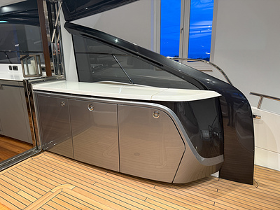 Engine air intake cover finished in Onyx Black metallic, canopy buttress above aft section of deckhouse glazing, cockpit headliner in Graphite Grey. Cockpit wet-bar fascia finished in Platinum gloss with Graphite grey gloss accent to bar.