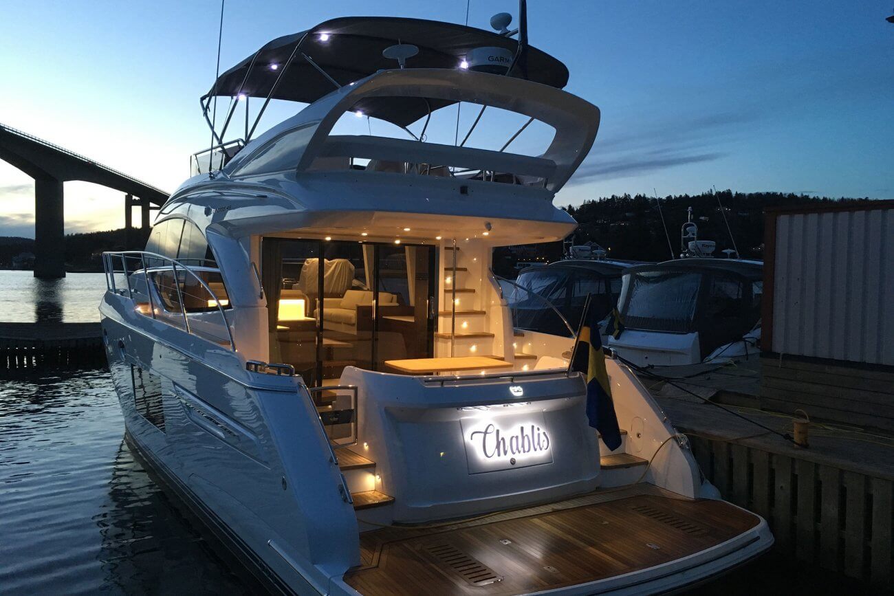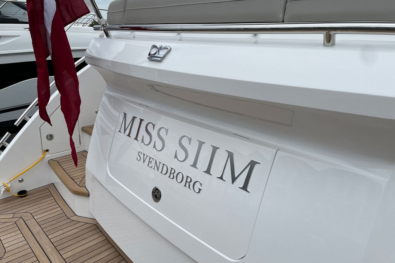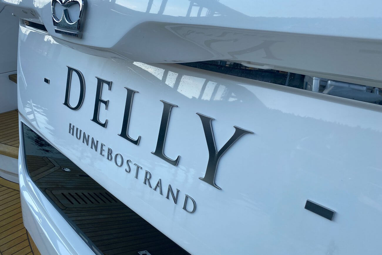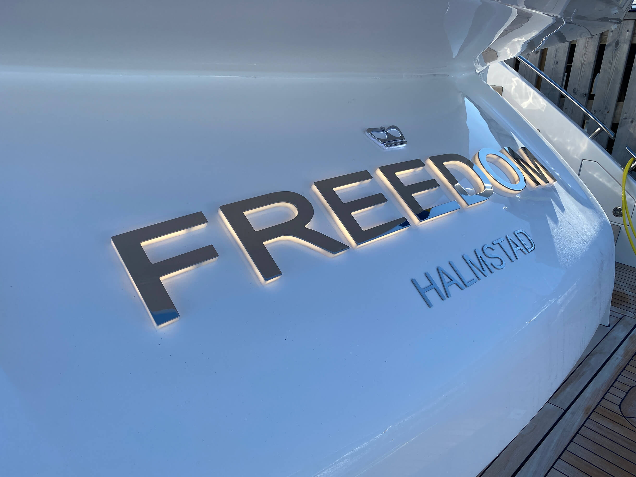 Navn i rustfrit stål med belysning i enhver skrifttype og størrelse. Ønskes hjemmehavn anbefales disse bogstaver uden belysning. Hvert bogstav er monteret med huller i plasten til strømforsyning og nogle gange også fastgørelse, hvilket medfører en omfattende plastreparation ved navneskift. Lysfarve og styrke er ikke garanteret og kan afvige fra anden belysning på båden. Plexiglas, der bruges til belysning, varierer i tykkelse og kan afvige fra prøvebilleder. Pris for skilt oplyses på forespørgsel. Cirka två dagars arbejde, opkræves løbende.