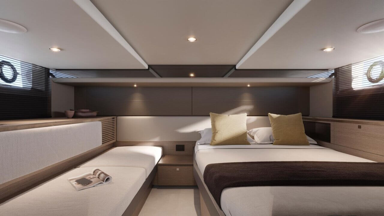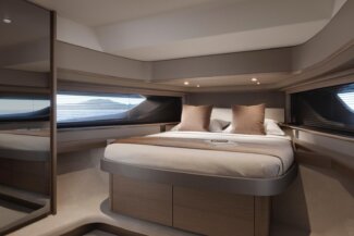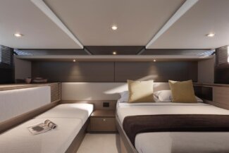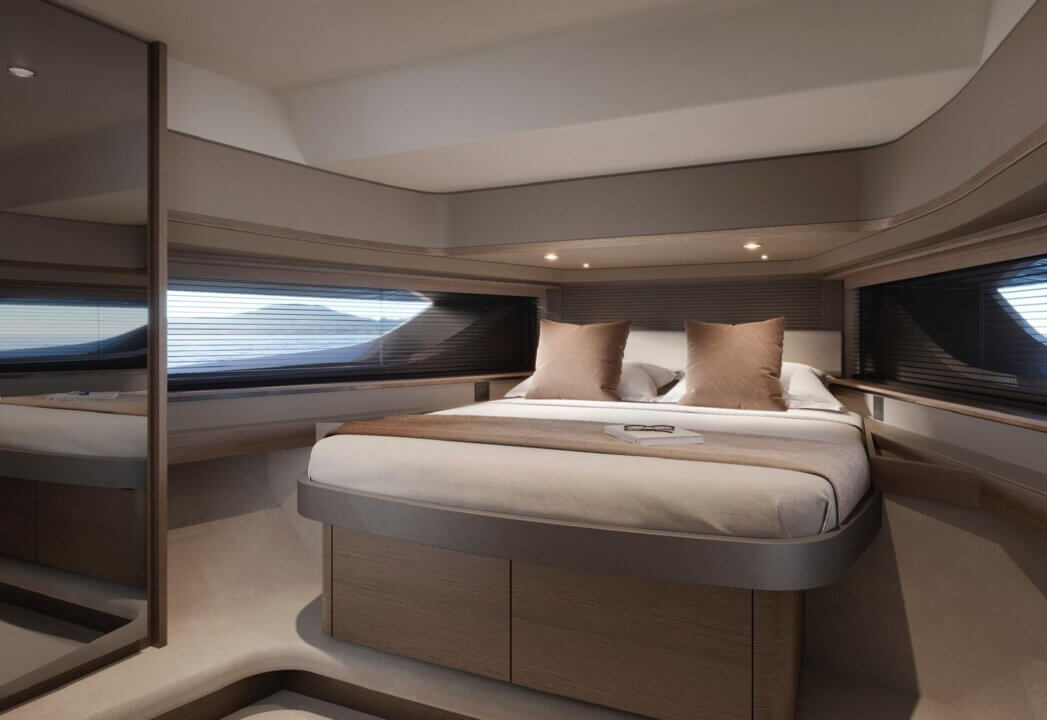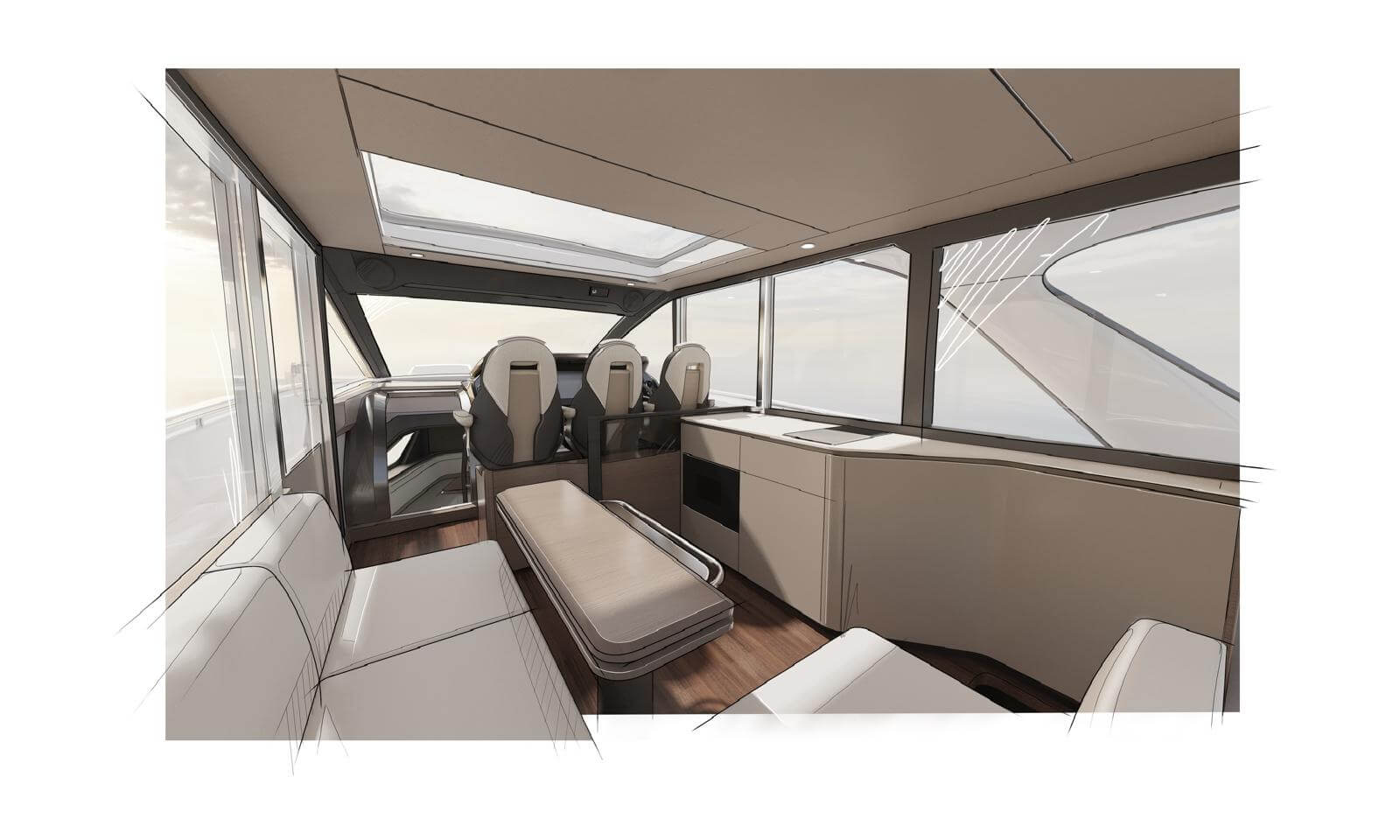 Den lyse salon rummer både siddegruppe og pantry og kan åbnes op med et skydetag og store glasdøre, der forbinder salonen med cockpittet. Her findes en rummelig spiseplads og wetbar til socialt samvær. Ved førerpladsen giver sidedøre nem adgang til dækket, og for indenbordsmodeller kan en hydraulisk badeplatform vælges for lettere adgang til vandet.