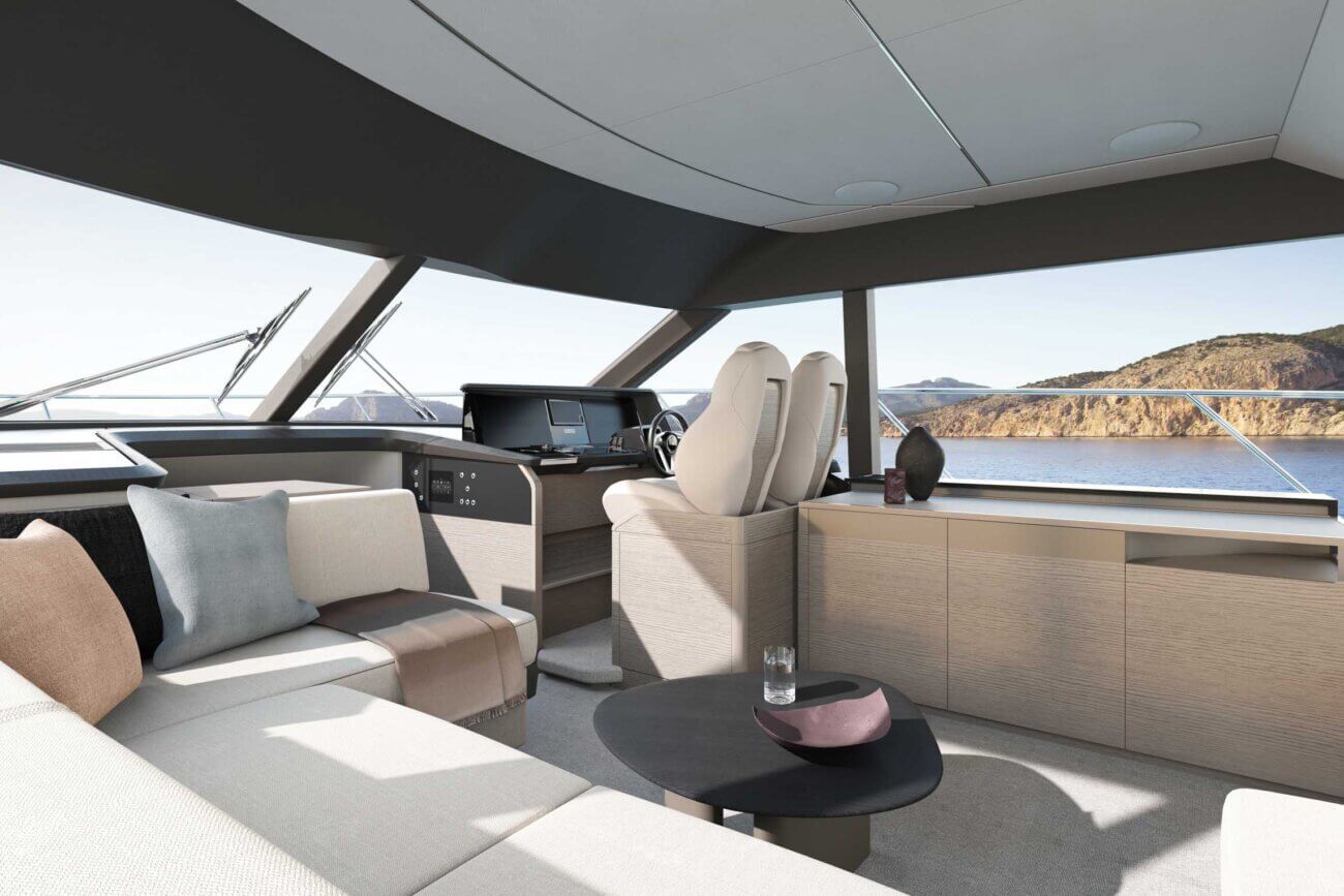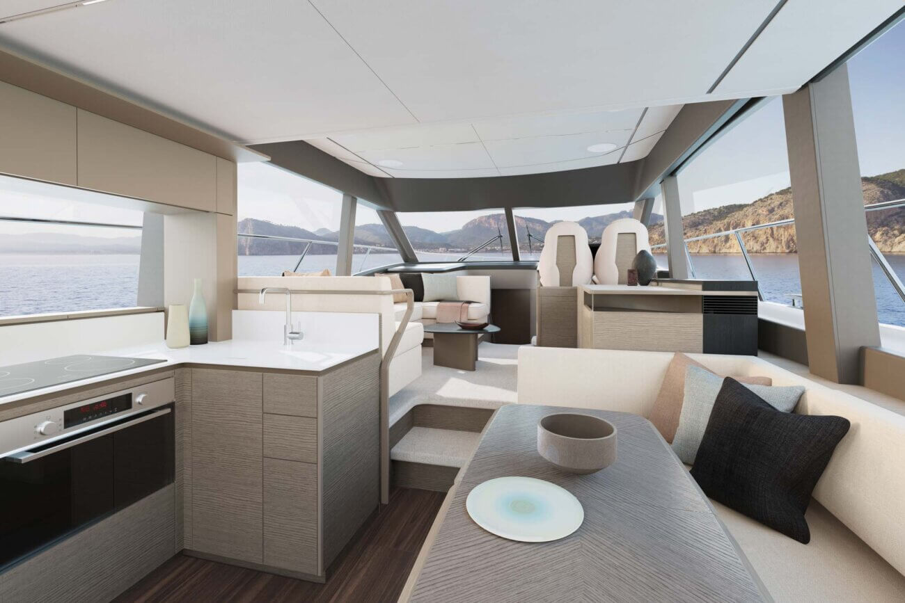 Den nyudviklede flybridge tilbyder store sociale områder med solsenge, spiseplads samt mulighed for wetbar og hardtop. På hoveddækket skaber agterkøkkenets layout en naturlig forbindelse mellem salon og cockpit, mens fordækkets justerbare siddepladser og solsenge indbyder til afslapning.