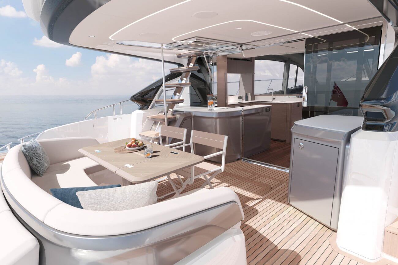 Hoveddækket flyder problemfrit fra ydersiden til indersiden, med store vinduer langs skroget, skydedøre agterud, et elektrisk skydbart tag og en siddegruppe, der forbinder wetbaren med det indre køkken.