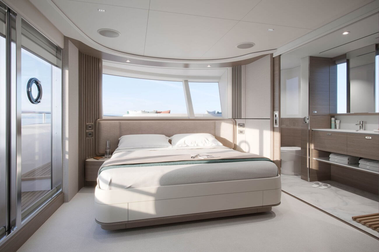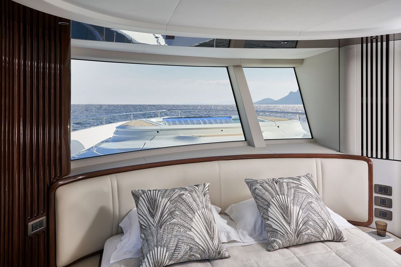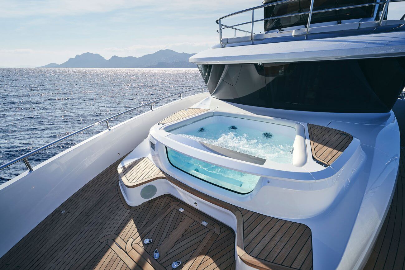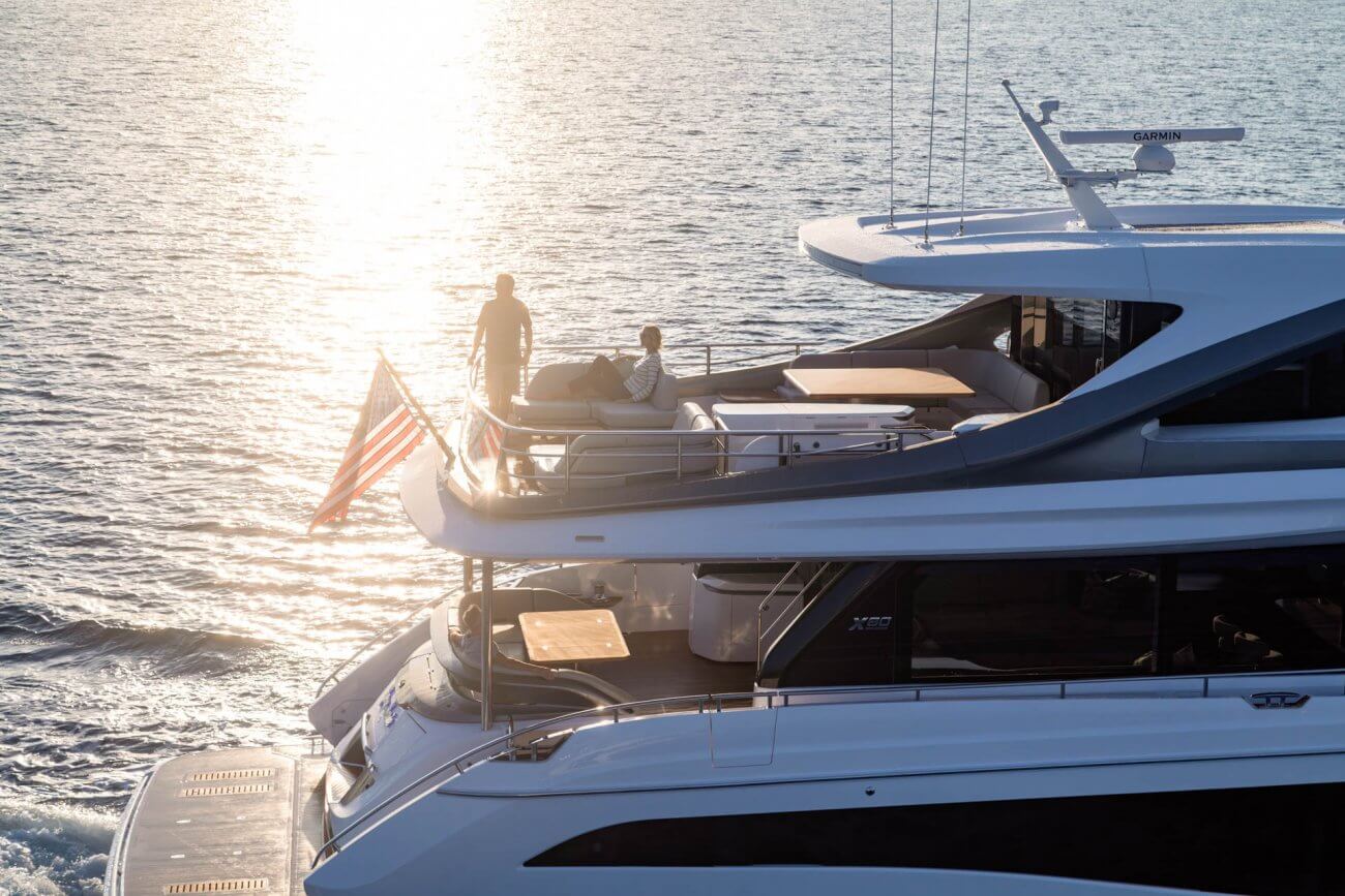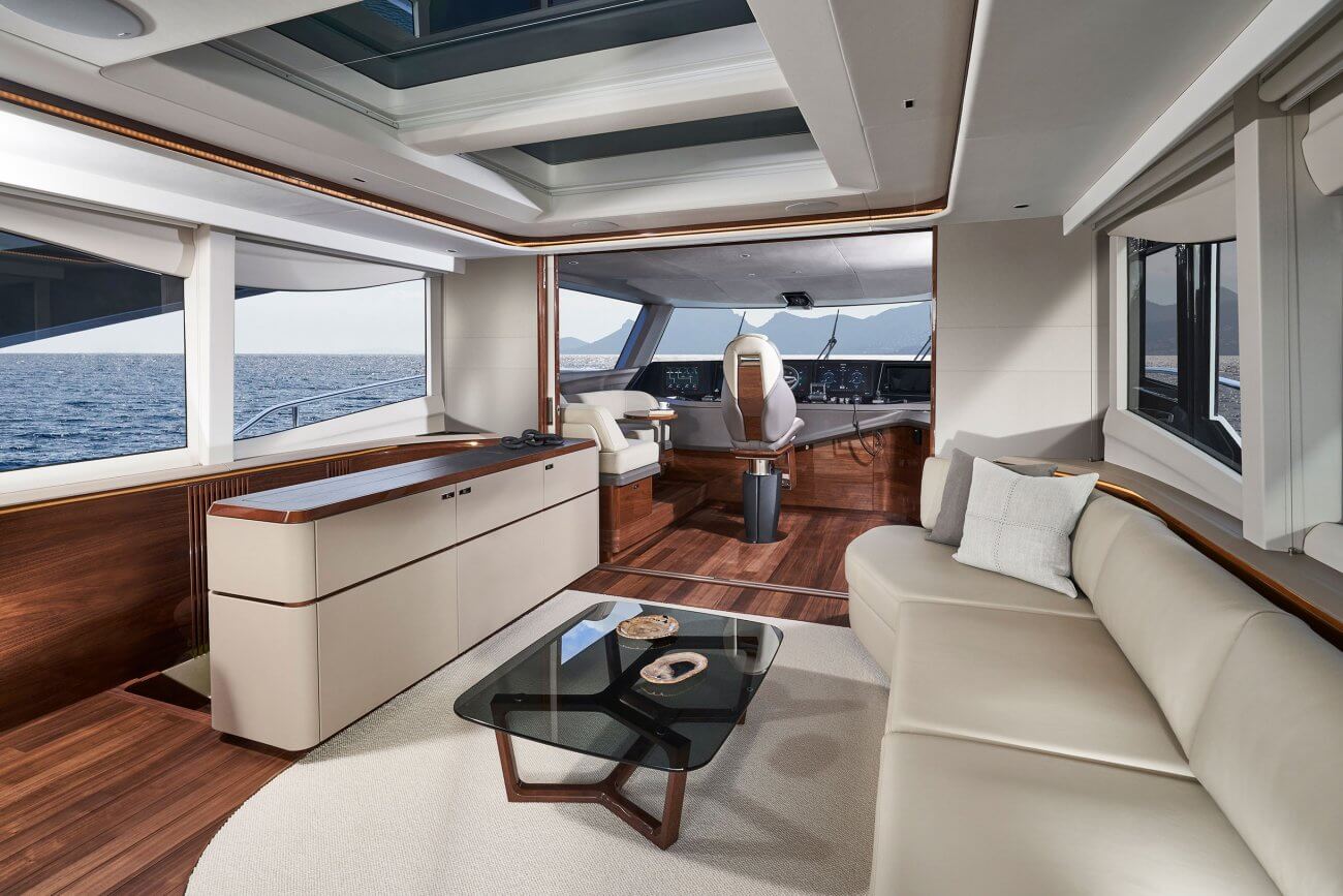 X80 profileres af den øgede højde på rælingen, øverste scandeck og den interne førerplads. Hendes S formede tag fortsætter ud gennem flybridge decket for at balancere den visuelle vægt og store volumen i den ekspansive sky lounge.