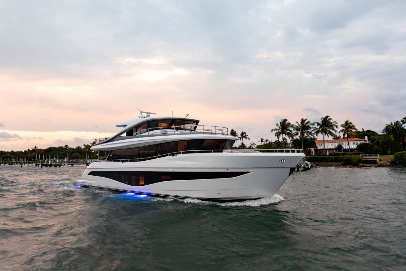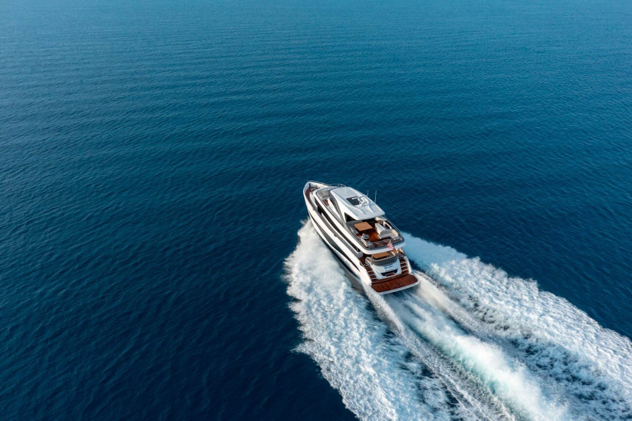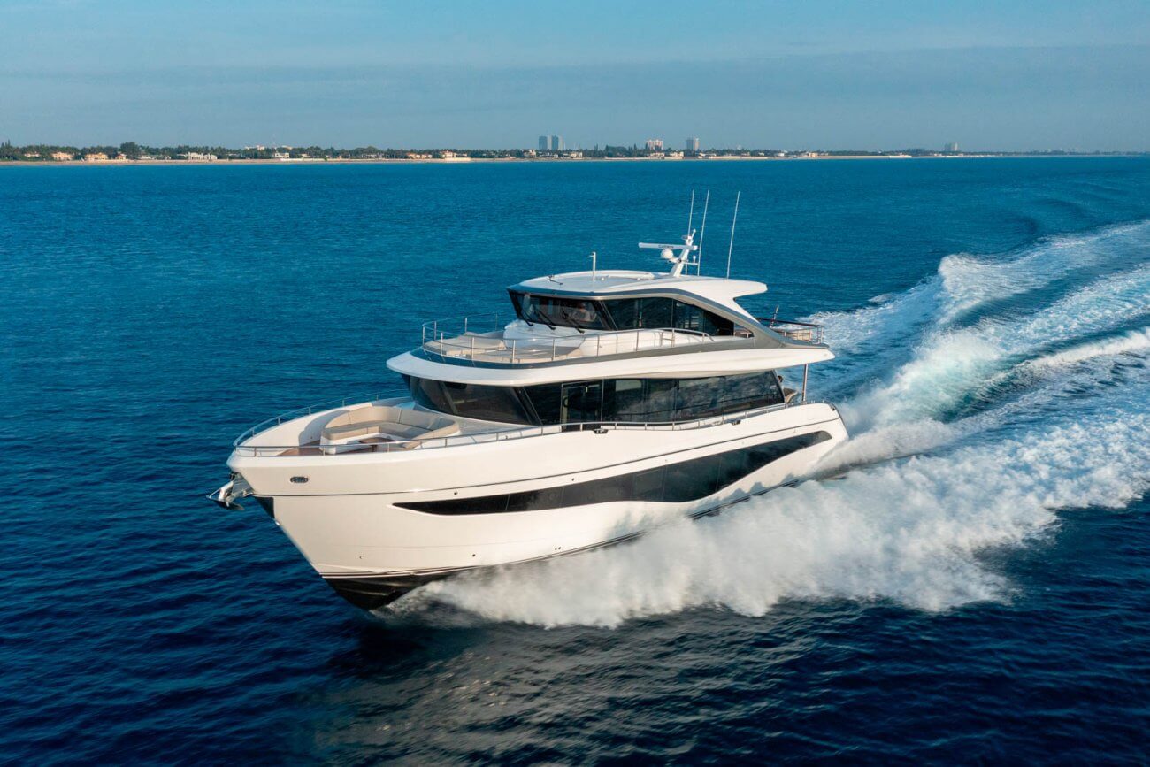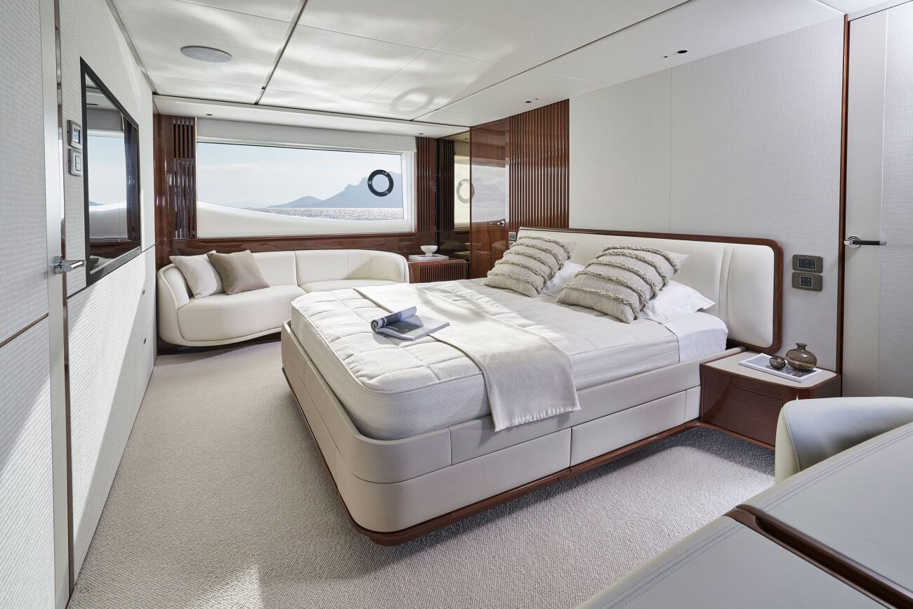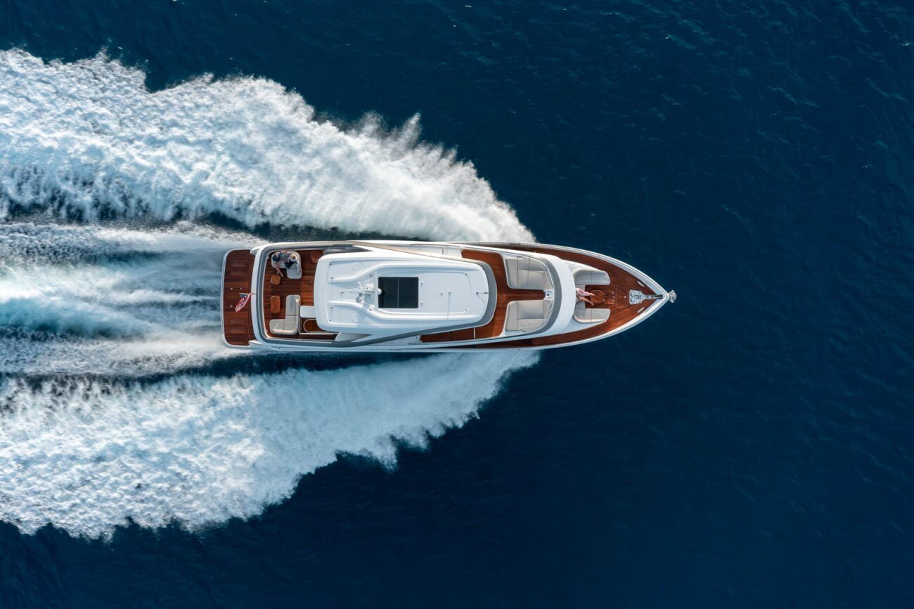 X80 profileres af den øgede højde på rælingen, øverste scandeck og den interne førerplads. Hendes S formede tag fortsætter ud gennem flybridge decket for at balancere den visuelle vægt og store volumen i den ekspansive sky lounge.