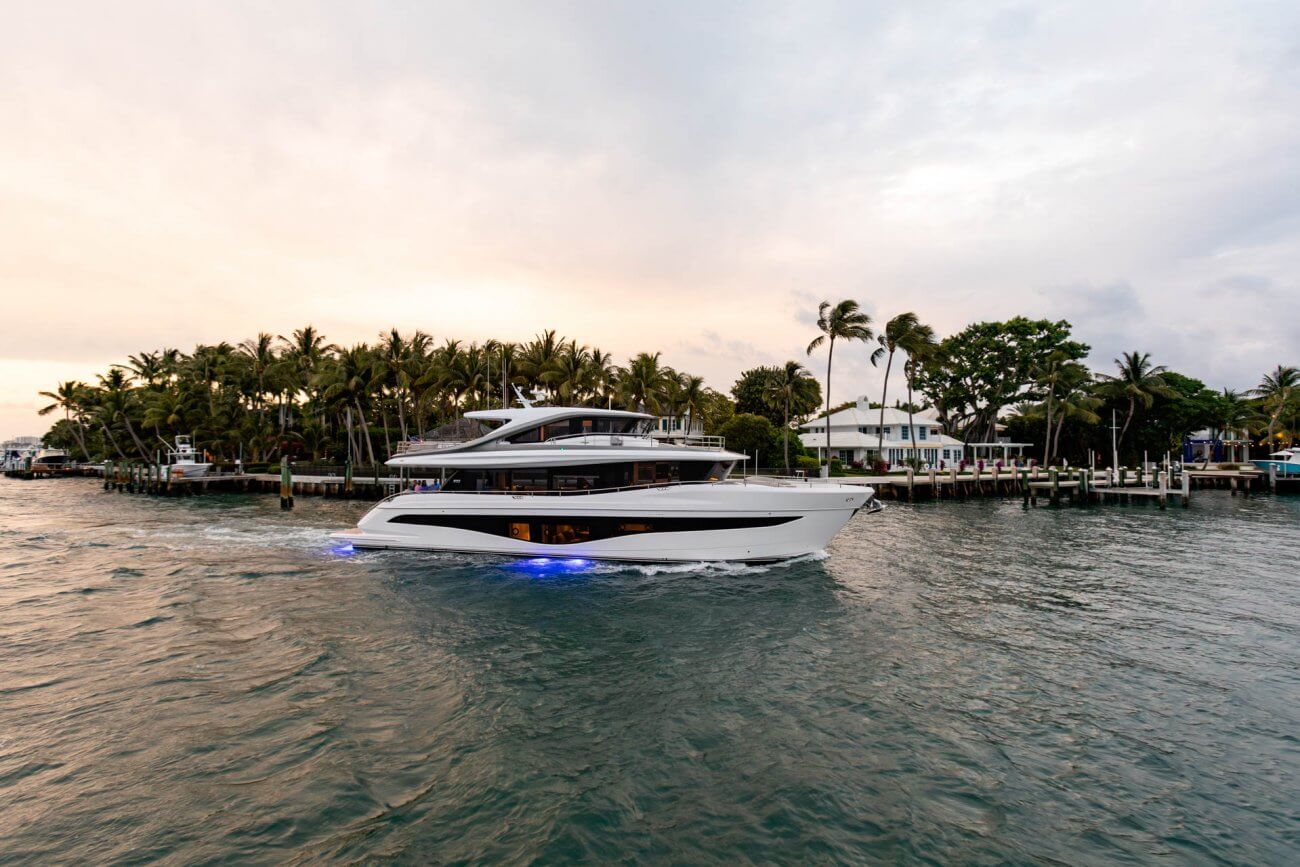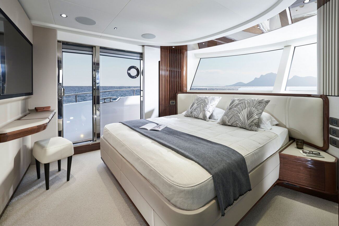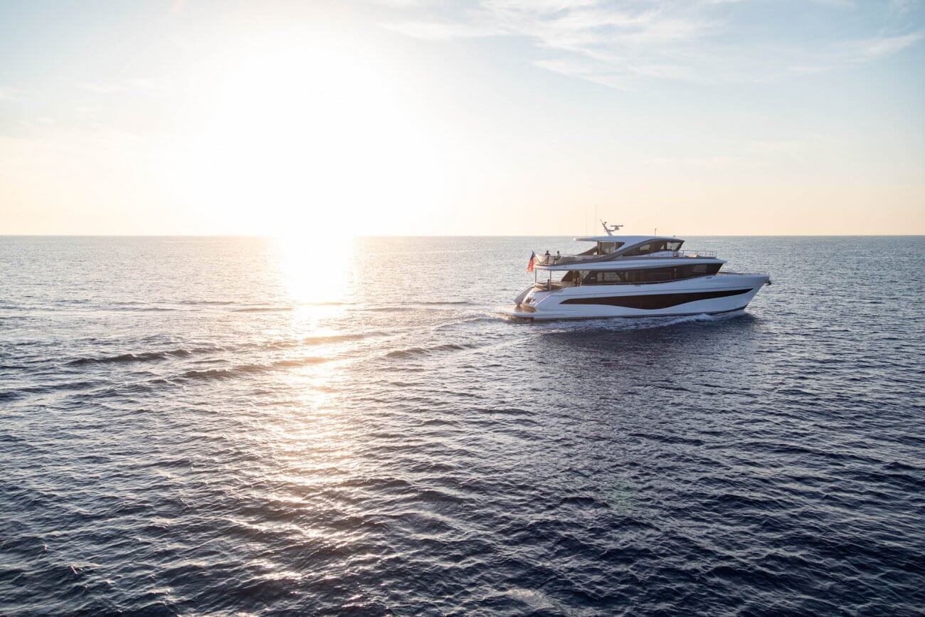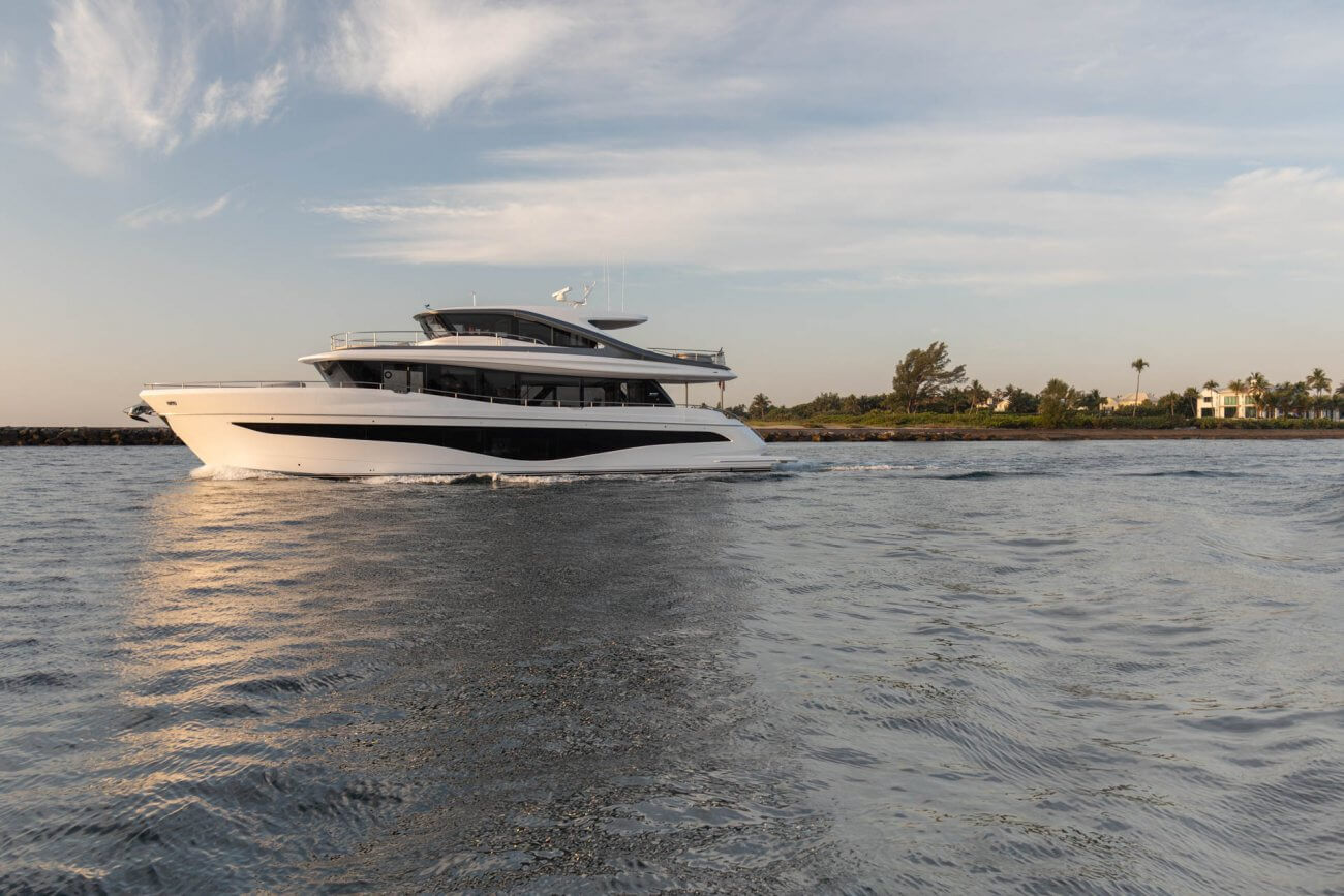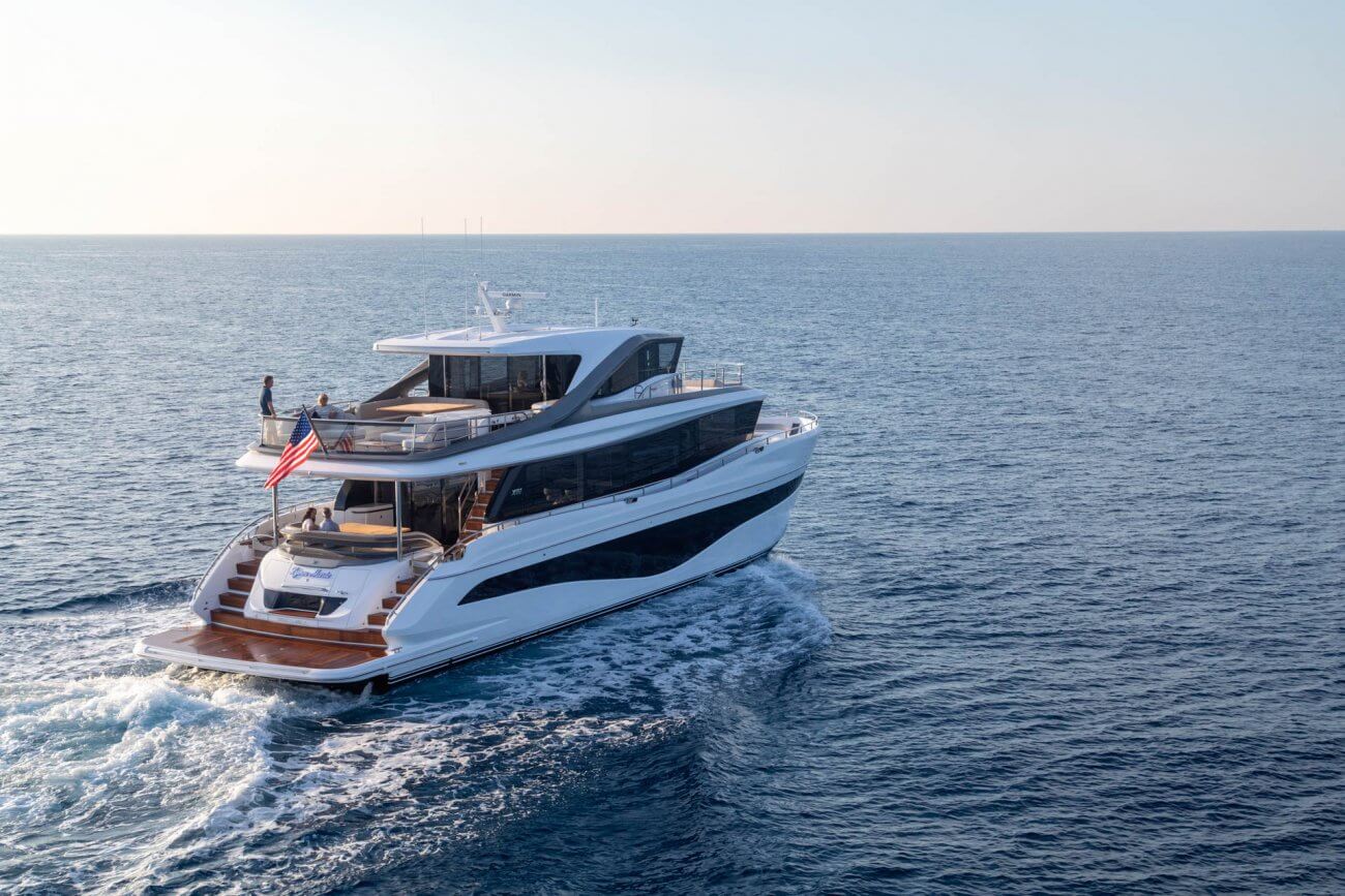 X80 profileres af den øgede højde på rælingen, øverste scandeck og den interne førerplads. Hendes S formede tag fortsætter ud gennem flybridge decket for at balancere den visuelle vægt og store volumen i den ekspansive sky lounge.