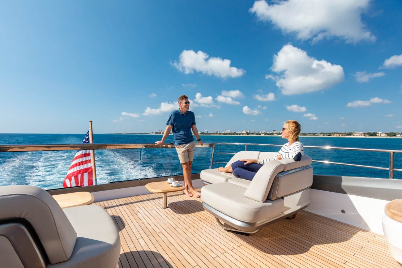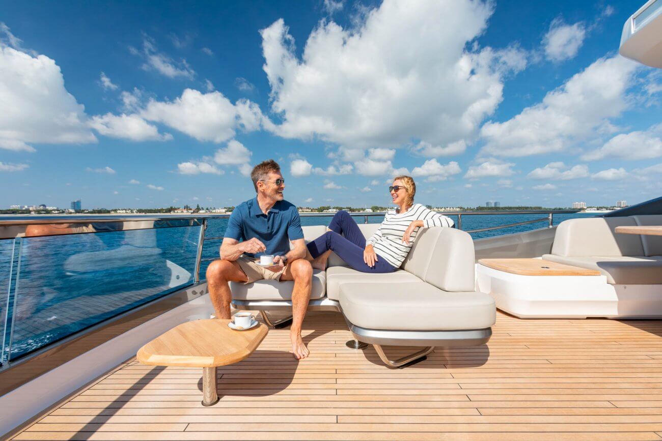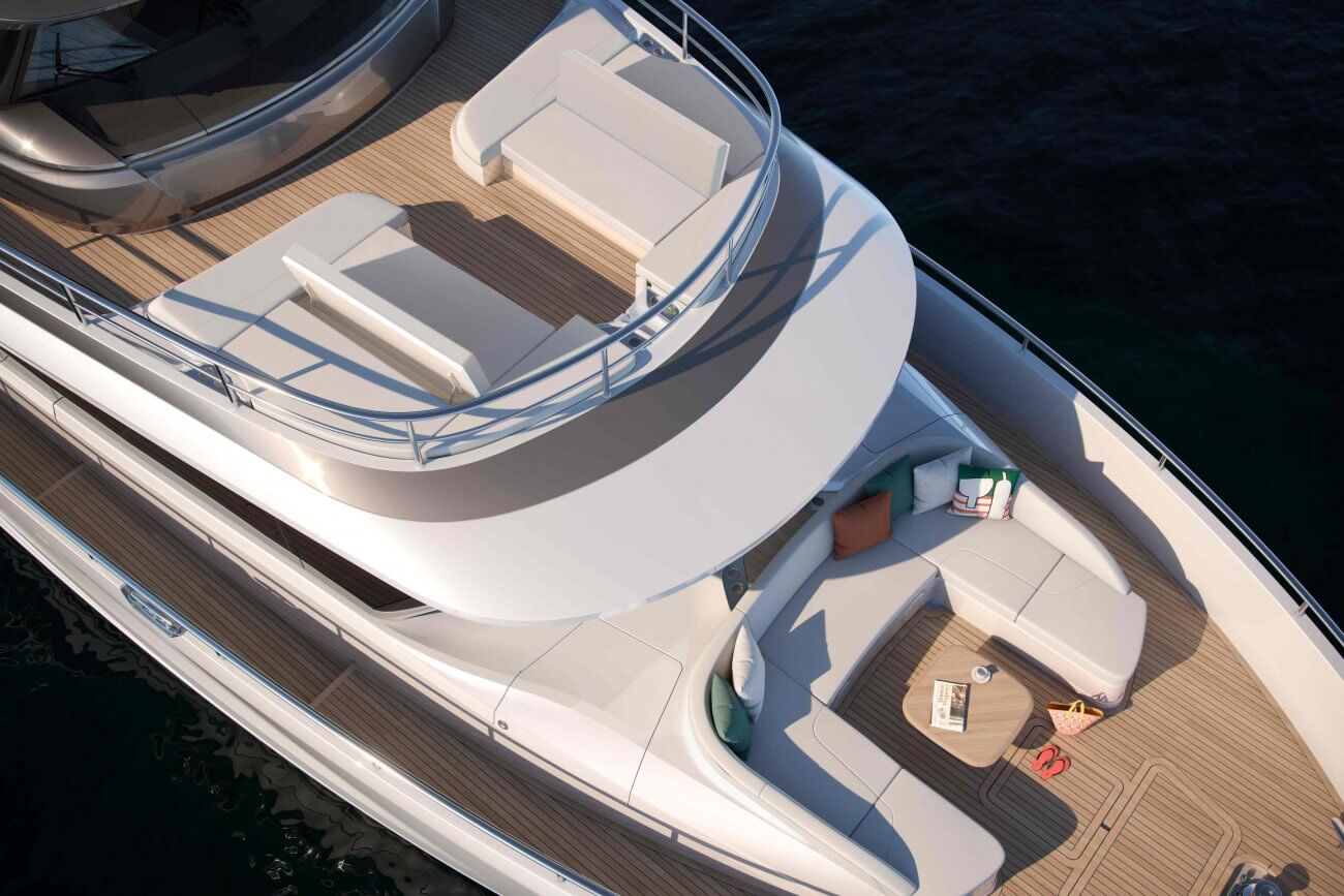 • Teak-laid transom platform, transom steps, cockpit deck, stairway to flybridge, side decks, steps to foredeck, flybridge aft sun deck and foredeck seating walkthrough areas