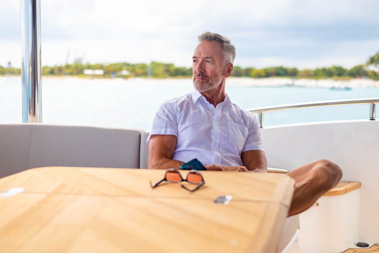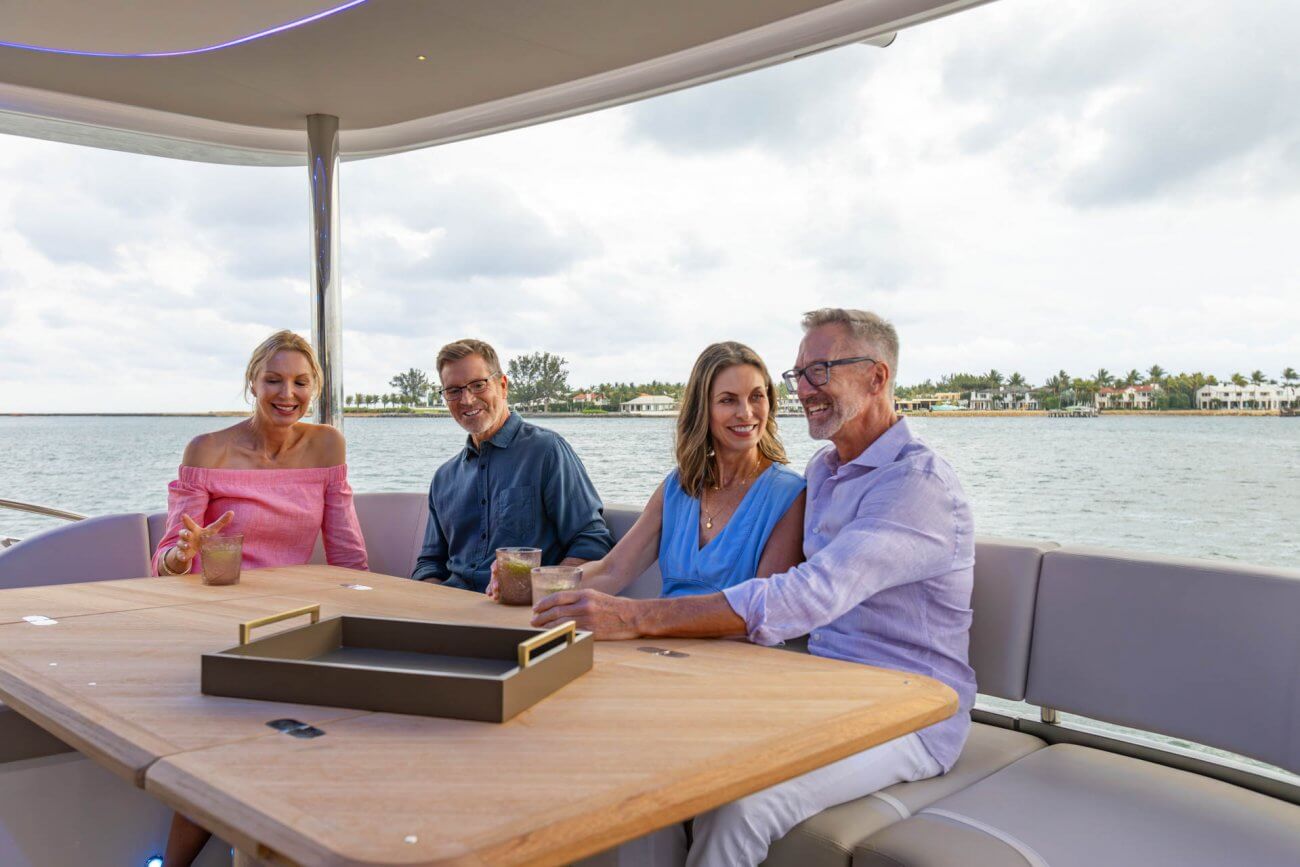 • L-shaped companion seating to port with deployable side table and optional navigator seat to starboard.