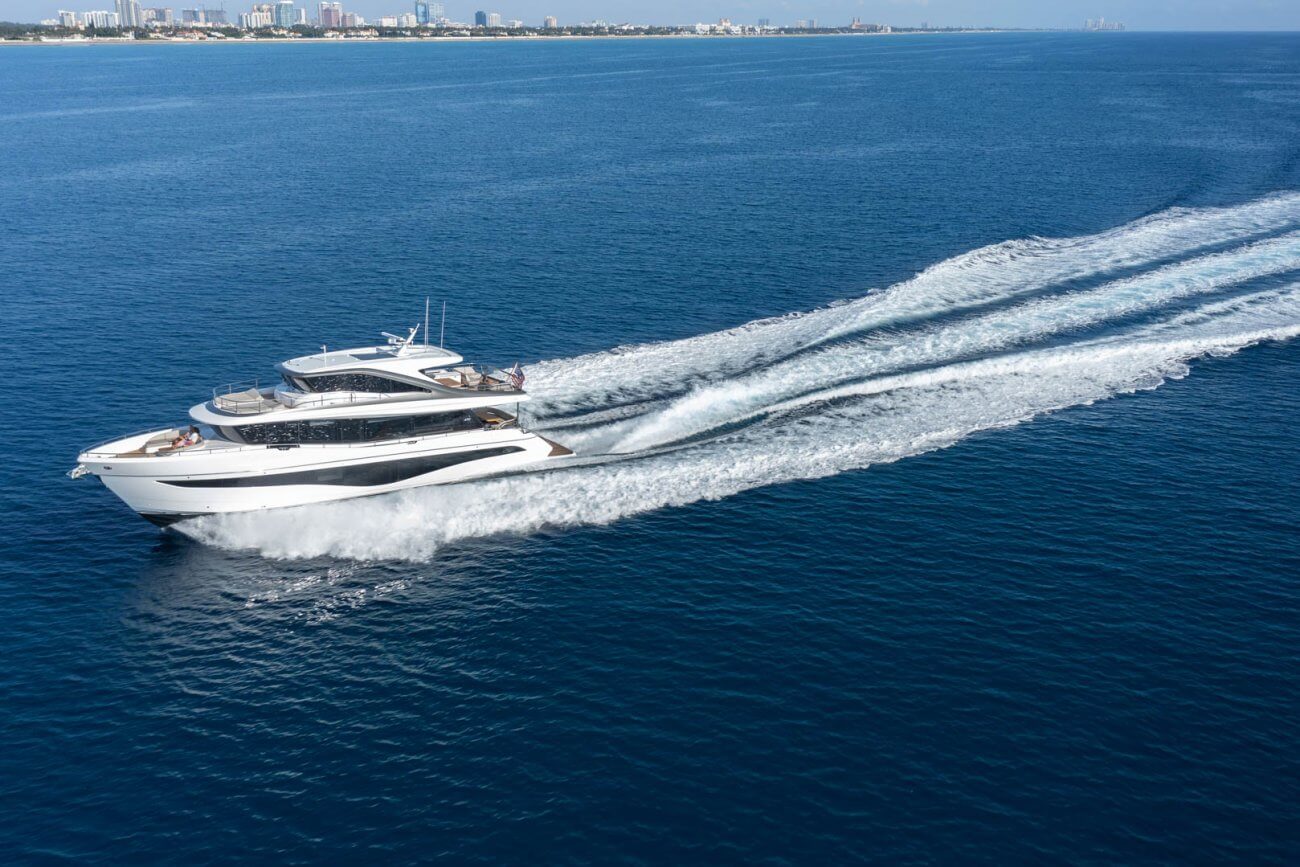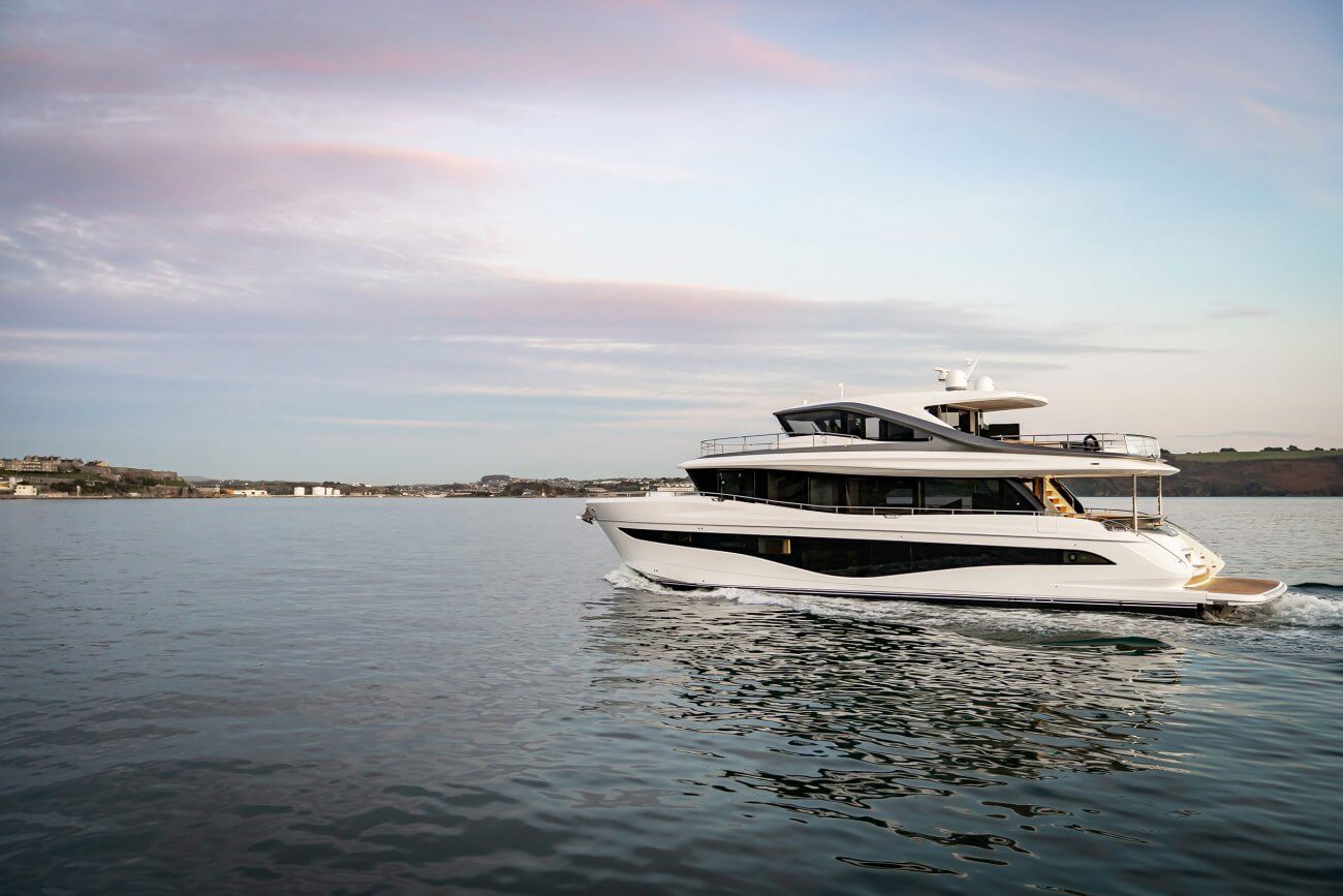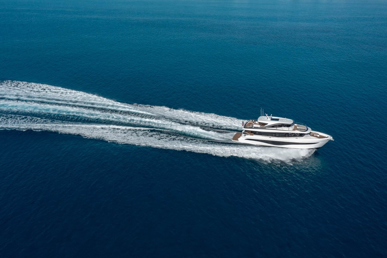 † Fart och räckvidd är uppskattade på en båt med standardutrustning och varierar beroende på skrovets renhet, akterdrevets skick, last, vatten- och lufttemperaturer, sjöförhållanden och andra faktorer. Uppskattningar ges därför i god tro men utan garanti eller några förpliktelser oss oss eller Princess Yachts International plc.