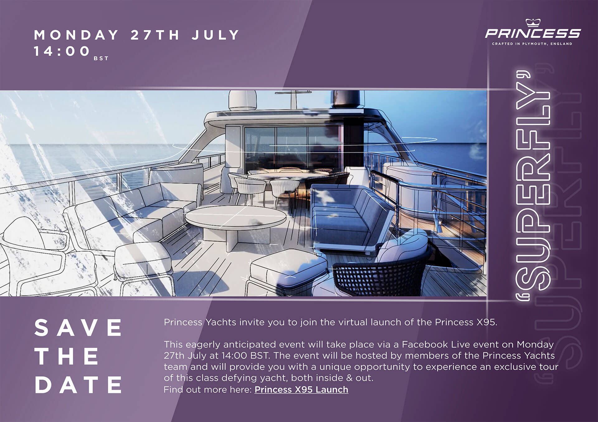 Princess Yachts er stolte over at kunne annoncere søsætning af det første længe ventede byggenummer 1 af den nye X95. Dette vil blive udsendt på en Facebook Live event på mandag den 27. juli 2010. Eventet vil løbe over et par timer og vil tilbyde en enestående mulighed for en eksklusiv tour af denne nye klasse ledende yacht både udvendig og indvendig