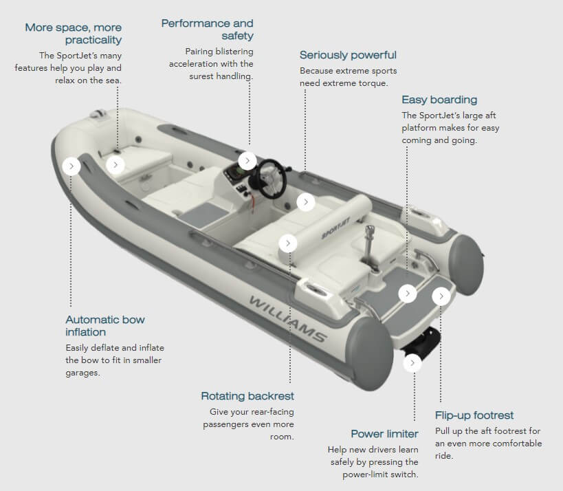 We’ve designed the SportJet 395 to fit on 20m+ yachts, perfect for ferrying up to 5 passengers from the jetty to your yacht or exploring those hard to reach calas, bays and beaches. Thanks to its industry leading 90hp BRP engine you will never be short of power exactly when you need it.